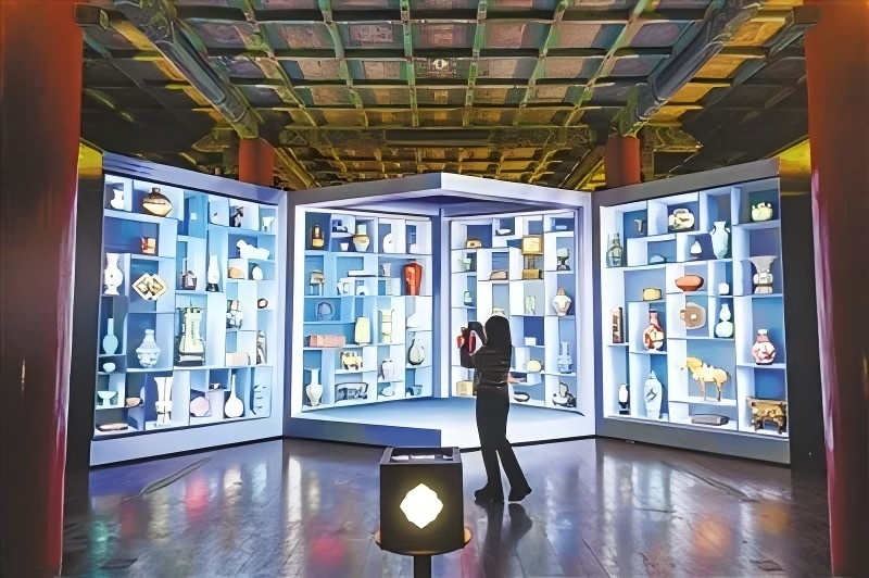 9月29日,“百年守护——从紫禁城到故宫博物院”展览开幕式在北京故宫博物院举行。展览展出文物200件(套),立体式阐释中华文明具有的突出的连续性、创新性、统一性、包容性、和平性,全方位展现故宫博物院发展历程。图为观众参观“遇见你的故宫色”裸眼3D数字展。 新华社记者 金良快摄